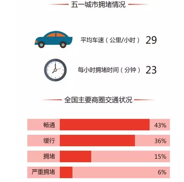 但也不是所有人可以拼出長假,趁著有限的假期吃喝玩樂成了不少人的選擇。據(jù)高德地圖預(yù)測,五一期間,全國近六成主要商圈交通都不暢通,全國城市平均車速為29公里/小時,每小時車程有23分鐘都在擁堵中度過。東莞、深圳、北京的高速將面臨擁堵,青島、天津的火車站附近交通狀況也很不樂觀。