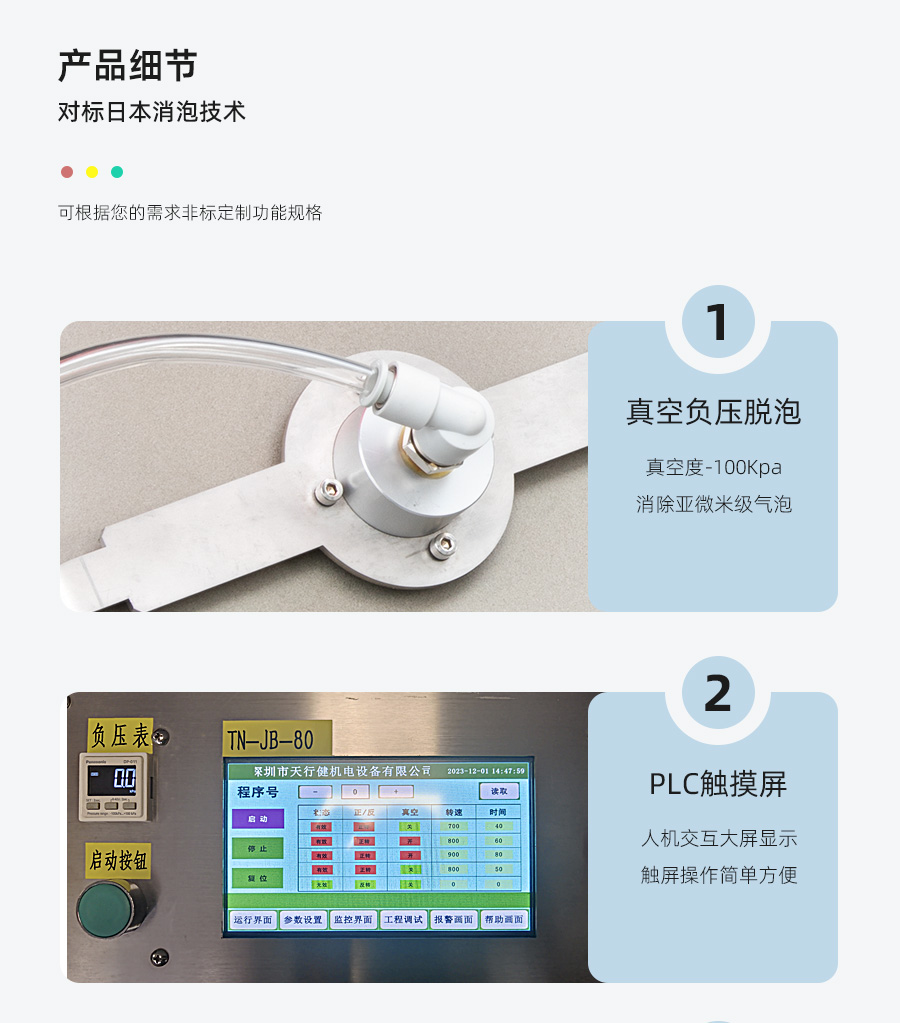 產(chǎn)品簡(jiǎn)介: 處理量6000ml/3000g×2,最大公轉(zhuǎn)速度1000Rpm,最大自轉(zhuǎn)速1000Rpm;公轉(zhuǎn)自轉(zhuǎn)獨(dú)立控制可調(diào); 自轉(zhuǎn)加公轉(zhuǎn)分離氣泡,再進(jìn)行真空負(fù)壓抽離氣泡,3分鐘快速消除亞微米級(jí)氣泡,使物料混合均勻、不分層、無(wú)氣泡的理想效果。